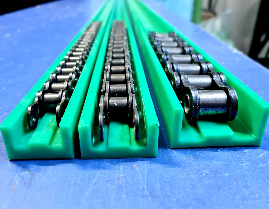 207 OT2 – ALPOLEN® 1000 Kanallı T Model Zincir Kızakları, konveyör zincirlerinin düşük sürtünme ve yüksek aşınma dayanımı ile çalışmasını sağlayan, özel kanallı kızak yapısı ile zinciri doğru hatta tutan ALPOLEN® (UHMW-PE) profil çözümüdür. Kanallı yapısı sayesinde zincirin çalışma stabilitesini artırır, titreşimi azaltır ve sessiz çalışma avantajı sunar. Teknik Özellikler