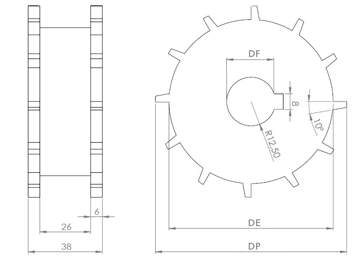 Modüler Bant Sistemlerinde Hassas ve Stabil Taşıma Çözümü361-25,4 damla model doğrusal hasır bant dişlisi, özellikle 25,4 mm damla süzgeçli doğrusal hasır bantlarla uyumlu olarak tasarlanmış modüler dişli elemanıdır. Damla model yapısı, bant dişleri ile tam uyum sağlayarak bantın kaymasını önler ve doğru hareketini garanti eder. Bu sayede konveyör hatlarında stabil ve senkronize taşıma sağlanır. Kullanım Alanları
