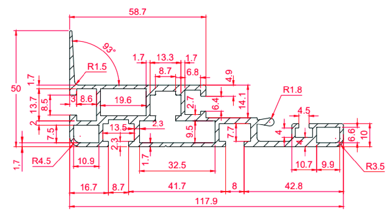 765 - 50x118 Konveyör Yan Şase Alüminyum Profil | Eloksallı Taşıyıcı Şase Profili 765 - 50 x 118 Konveyör Yan Şase Alüminyum Profil, konveyör sistemlerinde yüksek rijitlik ve taşıma kapasitesi gerektiren uygulamalar için geliştirilmiş dayanıklı bir yan şase profilidir. 50x118 mm ölçüsü sayesinde geniş yüzeyli ve güçlü bir taşıyıcı yapı sunar. Eloksal kaplaması, profilin korozyona karşı dayanıklılığını artırarak uzun ömürlü bir kullanım sağlar ve yüzeyin çizilme direncini yükseltir. Modüler konveyör hatlarında, otomasyon sistemlerinde ve ağır hizmet uygulamalarında güvenle tercih edilir. Teknik Özellikler