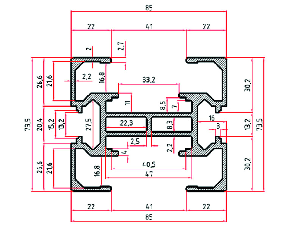 765 - 85 x 73,5 Eloksallı Sigma Alüminyum Profil, yüksek mukavemet gerektiren endüstriyel konstrüksiyonlar için özel olarak tasarlanmış geniş kesitli ve dayanıklı bir profil türüdür. Sigma formundaki T-kanal yapısı sayesinde modüler sistemlere tam uyum sağlar ve ağır yük altında dahi minimum deformasyon ile üstün stabilite sunar. Öne Çıkan Özellikler