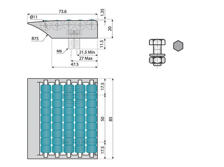 800 - Aktarma Tavası (5 Sıralı – 85 mm), yüksek adetli ürün akışının hızlı ve kontrollü şekilde yönlendirilmesini sağlayan, kompakt yapıda bir konveyör aktarma elemanıdır. 5 sıralı boncuk dizilimi ile maksimum akışkanlık sunar ve özellikle küçük–orta ölçekli ürünlerde yüksek hassasiyet sağlar.