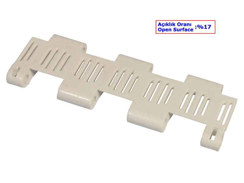 🔍 Ürün Tanımı 862 – 38,1 mm Izgaralı (Süzgeç) Plastik Hasır Bant, özellikle drenaj, hava akışı ve hijyen gerektiren üretim hatlarında yüksek performans sunmak için tasarlanmış güçlü modüler bir konveyör banttır. 38,1 mm kalınlığındaki sağlam modül yapısı, orta ve ağır yüklerde dahi stabil çalışma sağlar. Izgaralı (süzgeç) yapısı sayesinde sıvı akışı maksimum seviyeye çıkar, bant yüzeyinde birikmeyi önler ve hızlı kuruma – temizleme avantajı sunar. Gıda uyumlu plastik malzeme seçenekleri sayesinde, yıkama hatlarından dondurma tünellerine kadar birçok tesiste güvenle kullanılabilir. ⭐ Öne Çıkan Avantajlar
